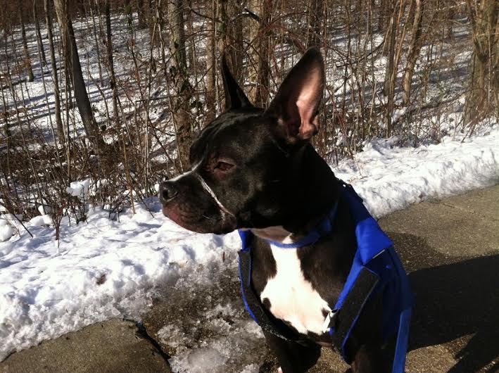 Baxter is a 2-year old Staffordshire Bull Terrier/Boston Terrier mix that lives with his owner, Marisa in Rockville, MD. Last summer Baxter was found in the parking lot of a veterinarian’s office in Atlanta, GA. He had been badly abused. His mouth had been muzzled shut for an extended period of time with wire, causing severe scarring. He had been thrown out of a car and was half starved. Despite all of the abuse he suffered he was still a happy and friendly dog. After several surgeries he was sent to the Boston Terrier Rescue of South Carolina and placed with a foster family.